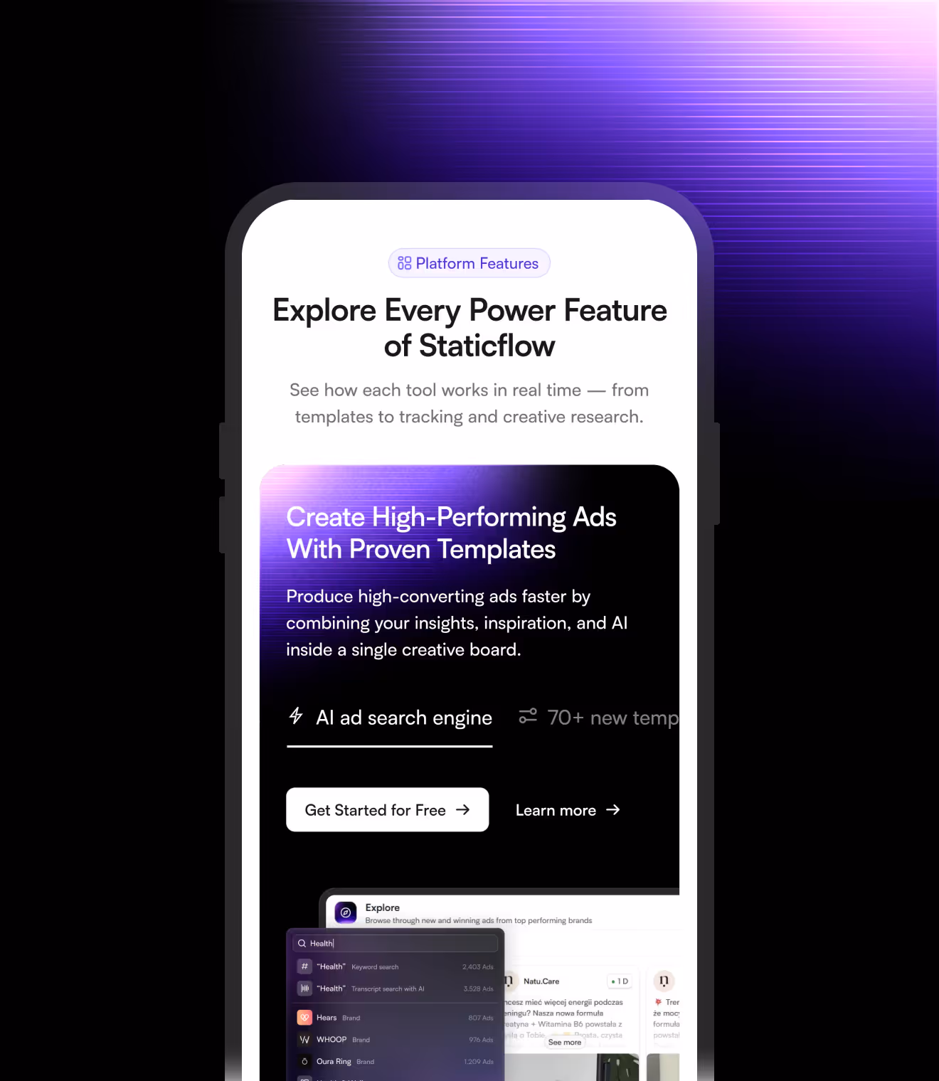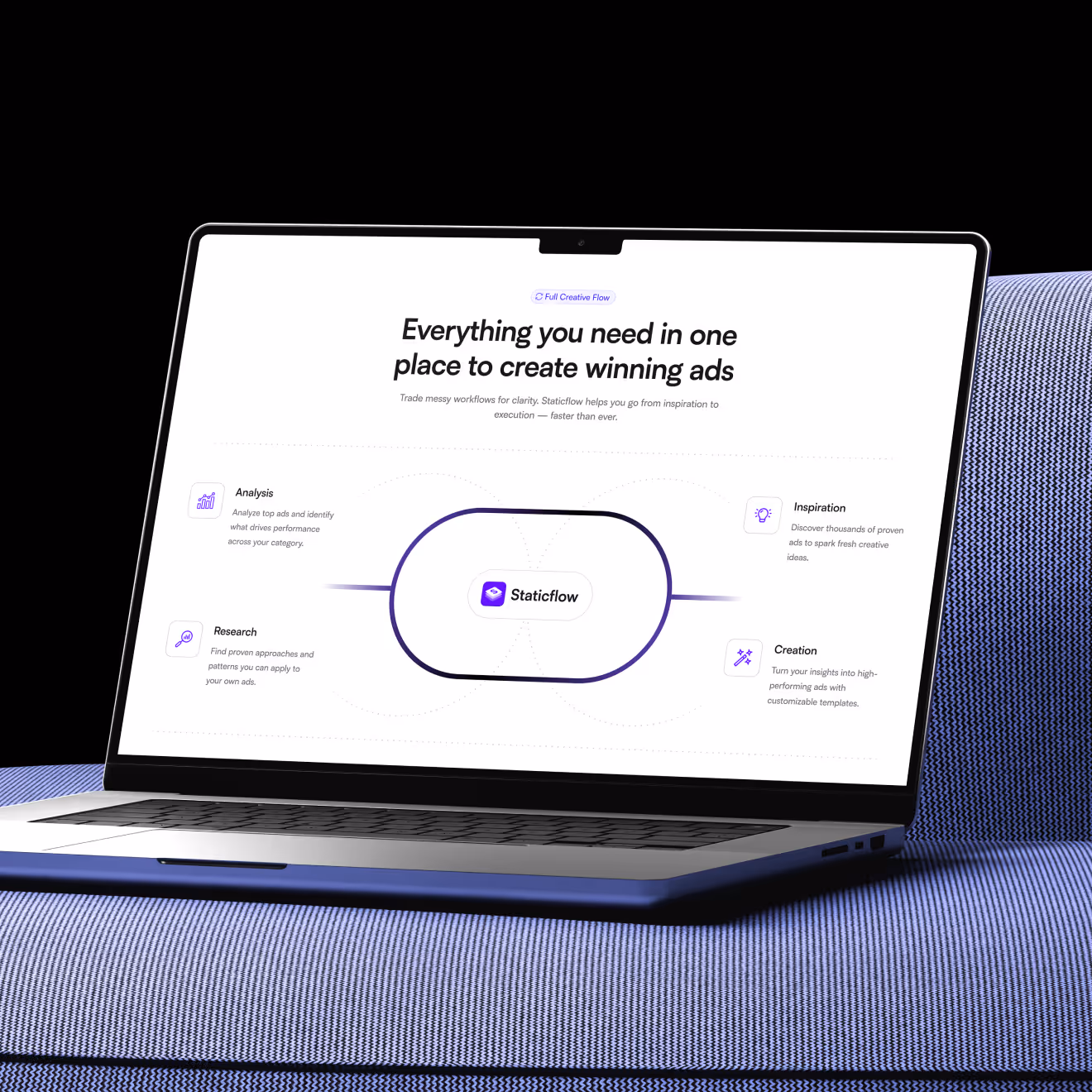 Staticflow helps e-commerce brands and ad agencies research competitors, discover winning ad angles, and design high-performing creatives – all from one platform. With tools for ad intelligence, inspiration boards, and AI-assisted creation, it replaces the scattered stack most teams rely on and gives them a single system to move from insight to launch without switching tabs.